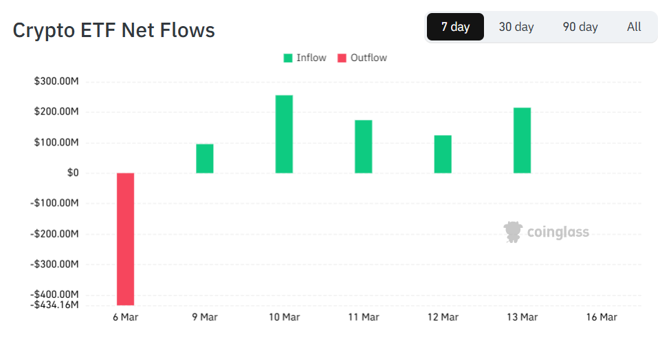 After a stretch of net outflows through late February and early March, the trend flipped on March 9, marking the first meaningful return of institutional capital into crypto investment products. The reversal became clear a day later: on March 10, spot crypto ETFs recorded more than $250 million in net inflows, signaling renewed demand from large investors.