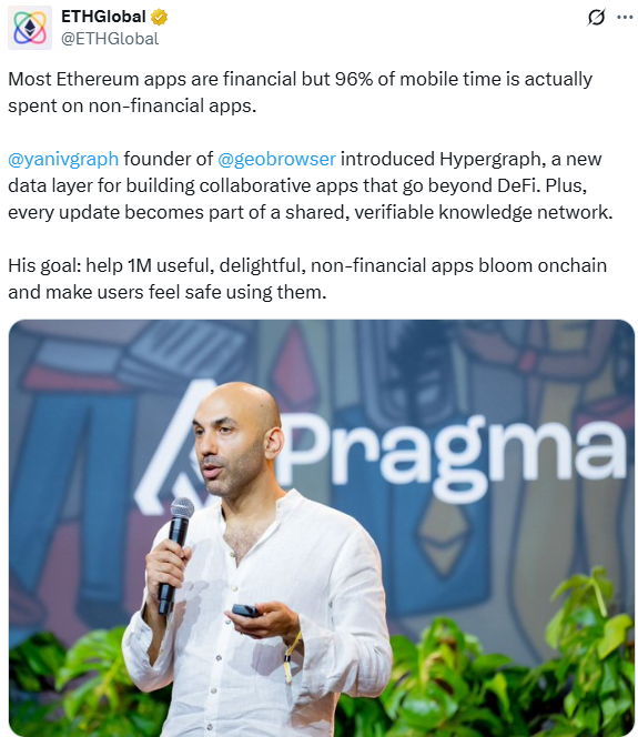 The conference buzzed with fresh launches and major news dropped by blockchain companies in attendance. Yaniv Tal, co-founder of The Graph, unveiled Hypergraph, a new data layer for collaborative, non-financial apps on Ethereum. Aiming to catalyze the release of “1M useful, delightful, non-financial apps” that prioritize user safety and shared knowledge networks, Tal highlighted how most mobile time is spent on non-DeFi apps, urging a shift beyond finance.