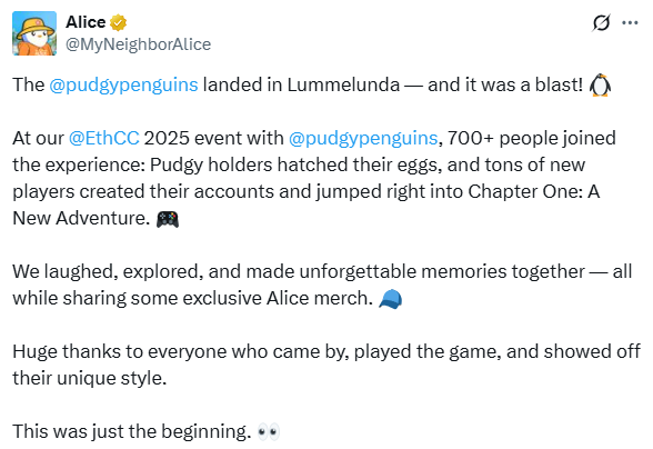 Amid the tech talks, EthCC’s Cannes idyllic setting proved that real-world connections trump digital. Beachside networking and informal vibes at private estates and resorts fostered deeper discussions between the industry’s movers, shakers, and rising stars. Memorable moments included the Pudgy Penguins and My Neighbor Alice (MNA) event in Lummelunda, where over 700 attendees hatched eggs, created accounts, and dove into gameplay, complete with exclusive merch.