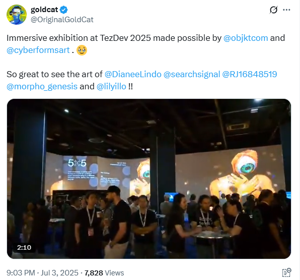 The Tezos art show at TezDev 2025, held alongside EthCC at Hôtel Martinez, featured an immersive exhibition with works from over 30 artists via Objkt.com, including pieces by Diane Lindo, Anya, RJ, Morpho Genesis, and Lilyillo. It capped sessions on Tezos X, gaming on Etherlink, and RWA tokenization, blending art with tech in a continuous-screen display.