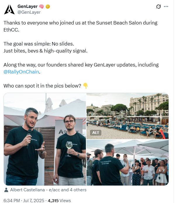 GenLayer’s Sunset Beach Salon stood out for its no-slides approach, focusing on “bites, bevs & high-quality signal.” Founders shared updates like RallyOnChain amid casual chats, capturing the event’s relaxed yet productive energy. The rAAVE party at Villa Montana, attended by Chainlink’s Sergey Nazarov and Aave’s Stani Kulechov, wrapped things up on a high note.