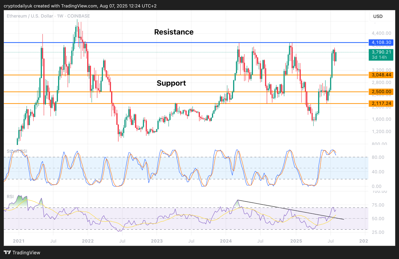 Zooming right out into the weekly view, it can be seen how the last two pivot highs stopped right at the $4,100 horizontal resistance. With further resistance showing back in 2021, this has become an almighty level, and will require a huge effort from the $ETH bulls to break it.