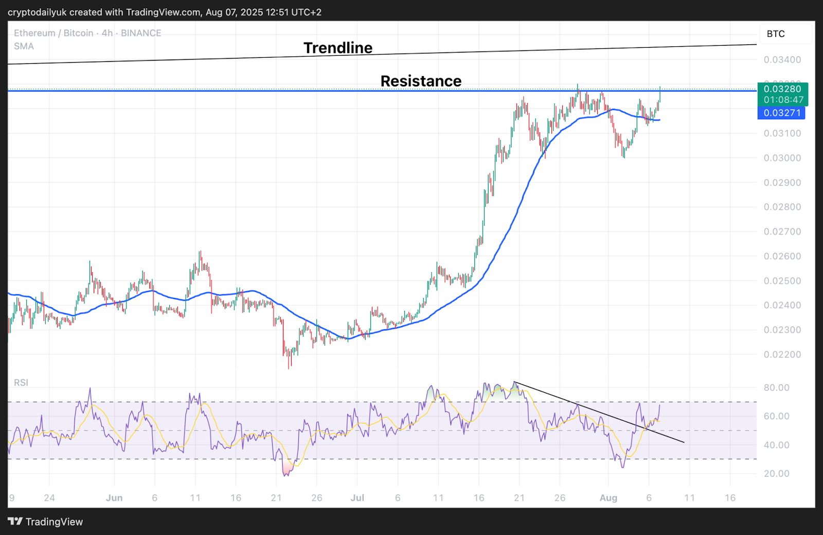 At the bottom of the chart, the RSI reveals a breakout of the descending trendline, a retest, and the indicator line heading higher. This would definitely support the thesis of an ETH/BTC breakout of this level.