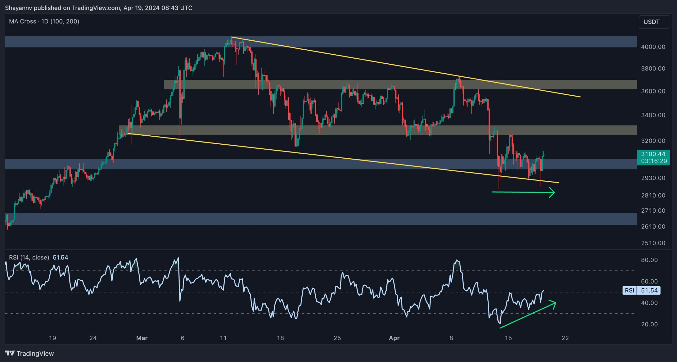 This range carries significance as it attracts considerable demand, potentially hindering further downward pressure from market sellers. Additionally, a minor bullish divergence between the price and the RSI indicator suggests the potential for a bullish resurgence, targeting a reclaim of the $3.5K threshold. However, despite the bullish indications, an unexpected breach below this critical support zone could trigger a cascade effect toward the 200-day moving average at $2.5K.