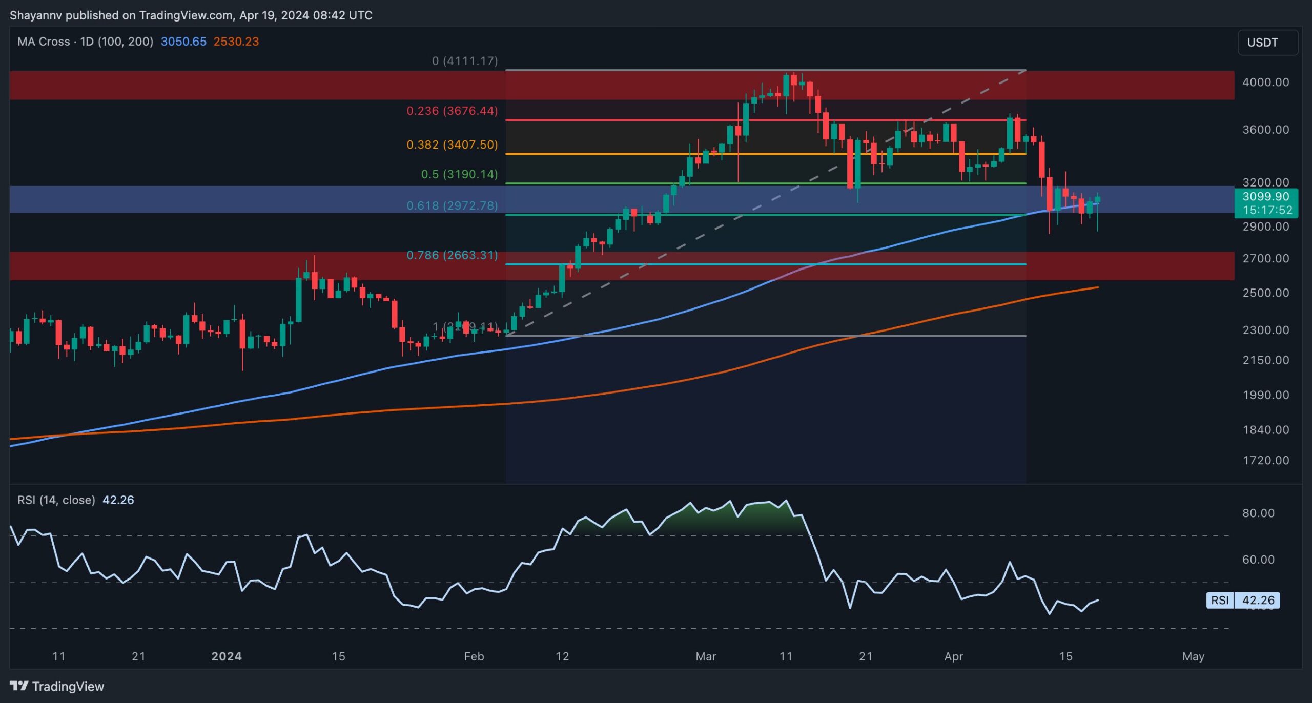 This zone encompasses the 100-day moving average at $3050 and the significant price range between the 0.5 ($3190) and 0.618 ($2972) Fibonacci levels.