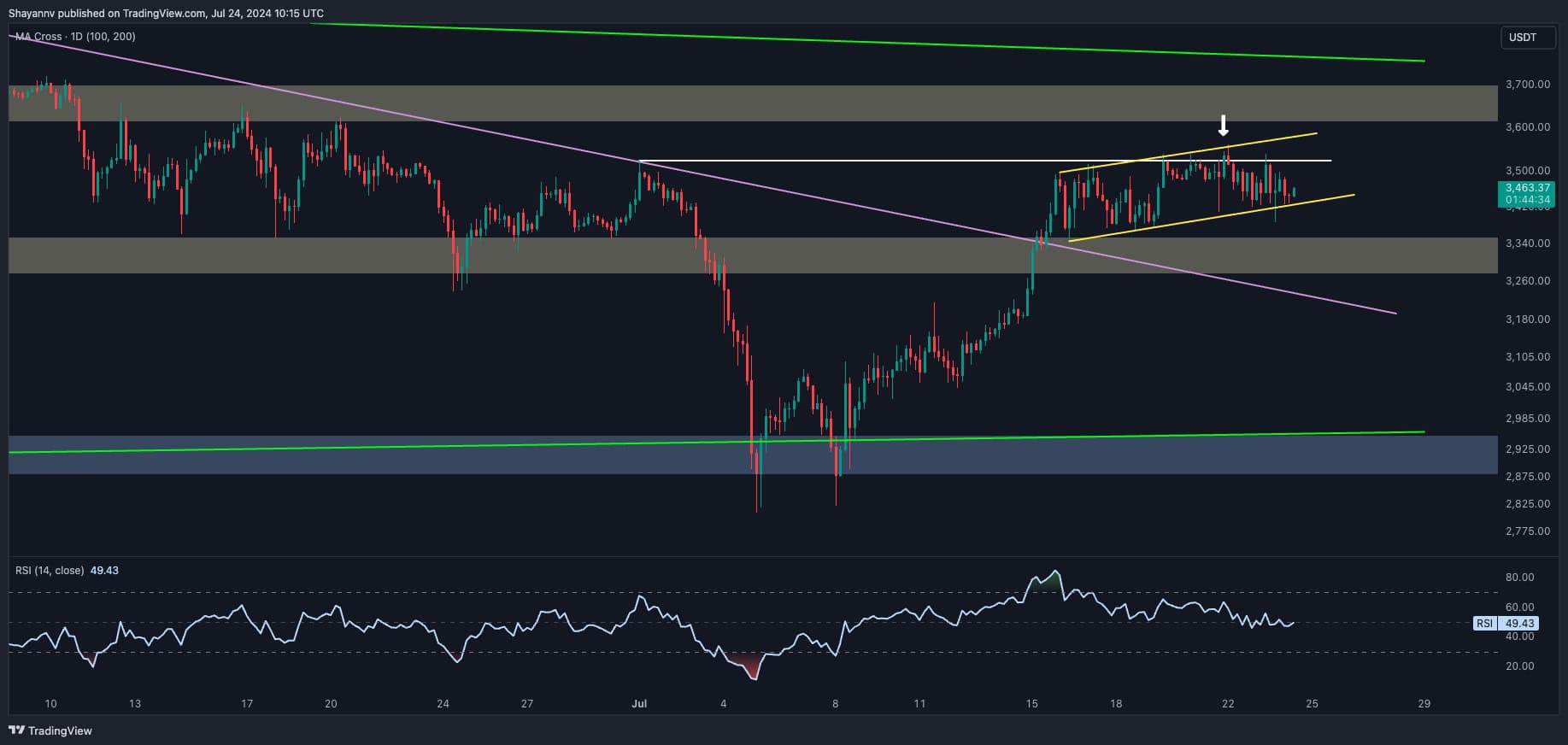 In summary, the price is confined within a crucial range, bounded by the wedge’s upper boundary ($3.7K) and significant support at $3.4K. A bullish breakout seems more likely.