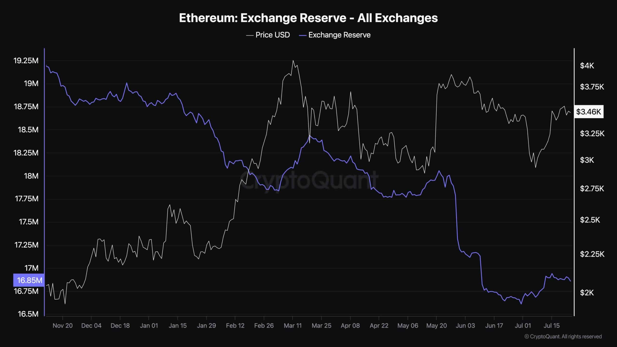 The chart below displays the Ethereum Exchange Reserve metric, which measures the amount of ETH held in exchange wallets. An increase in exchange reserves typically indicates that investors are depositing their coins to exchanges, likely for selling. Conversely, a decrease suggests accumulation by holders, as coins are withdrawn from exchanges for long-term storage.