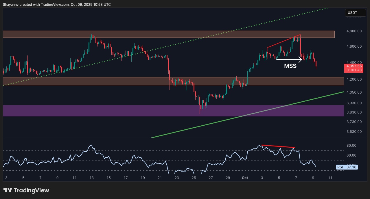 Ethereum’s bullish structure has started to show early signs of exhaustion as the price retraces from the $4,400 resistance zone. Despite maintaining a strong mid-term uptrend, short-term momentum has weakened after a local bearish divergence and a recent market structure shift.