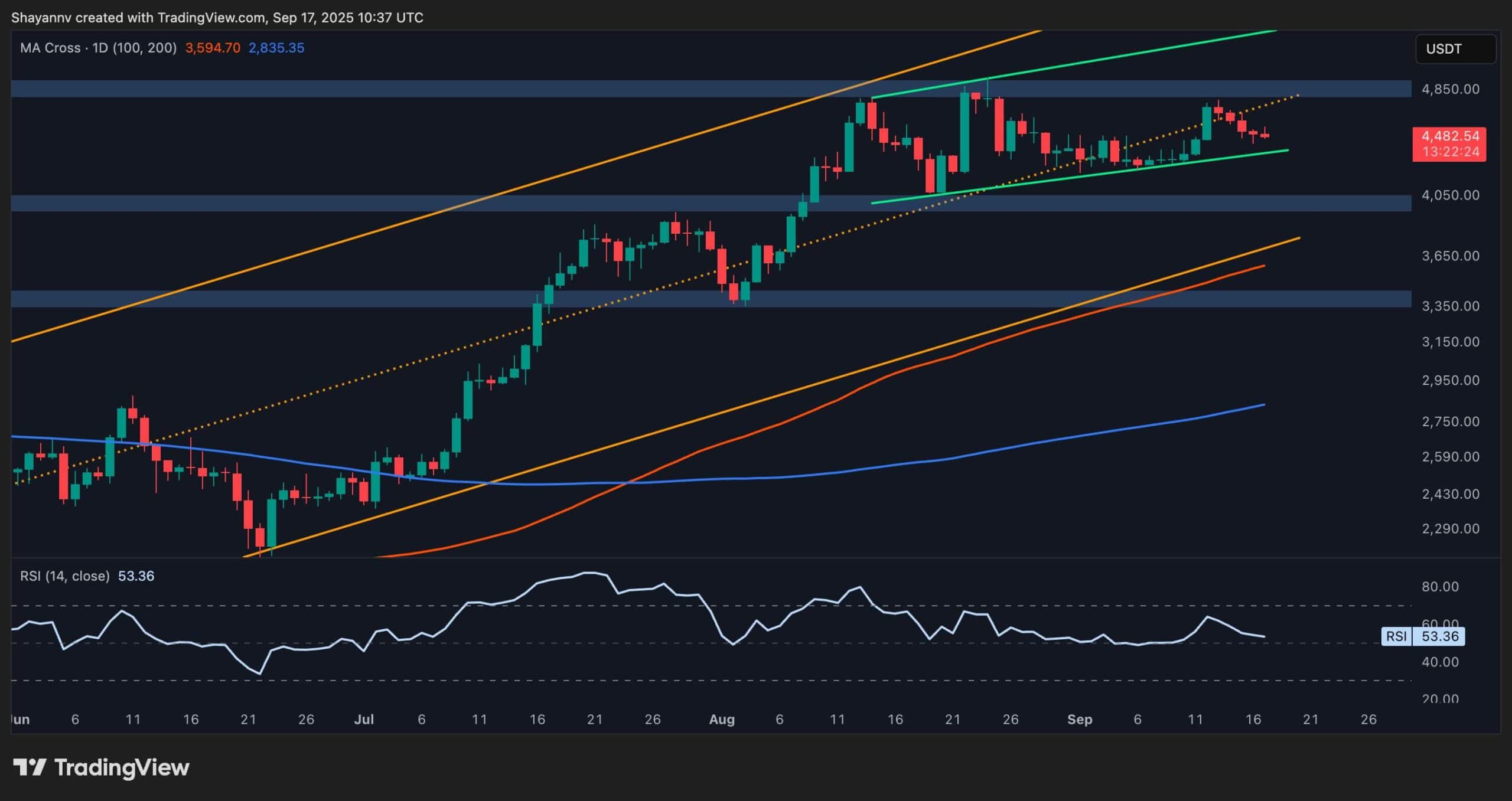 If ETH breaks above the $4,850 ceiling with volume, the rally could extend toward the channel’s upper boundary. On the flip side, a breakdown from the current ascending pattern could see ETH retest the $4,000 zone before finding fresh buyers.