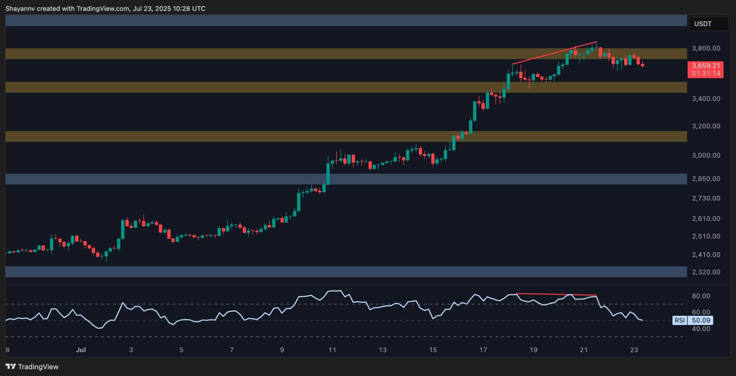 On the 4-hour timeframe, ETH has been showing bearish divergence between price and RSI. While the price pushed higher into $3,800, the RSI has been forming lower highs, suggesting that momentum is fading. The RSI has now dropped to around 50, showing a loss of short-term bullish pressure. The asset is currently consolidating inside a tight range between $3,500 and $3,800, with multiple rejections from the latter area.