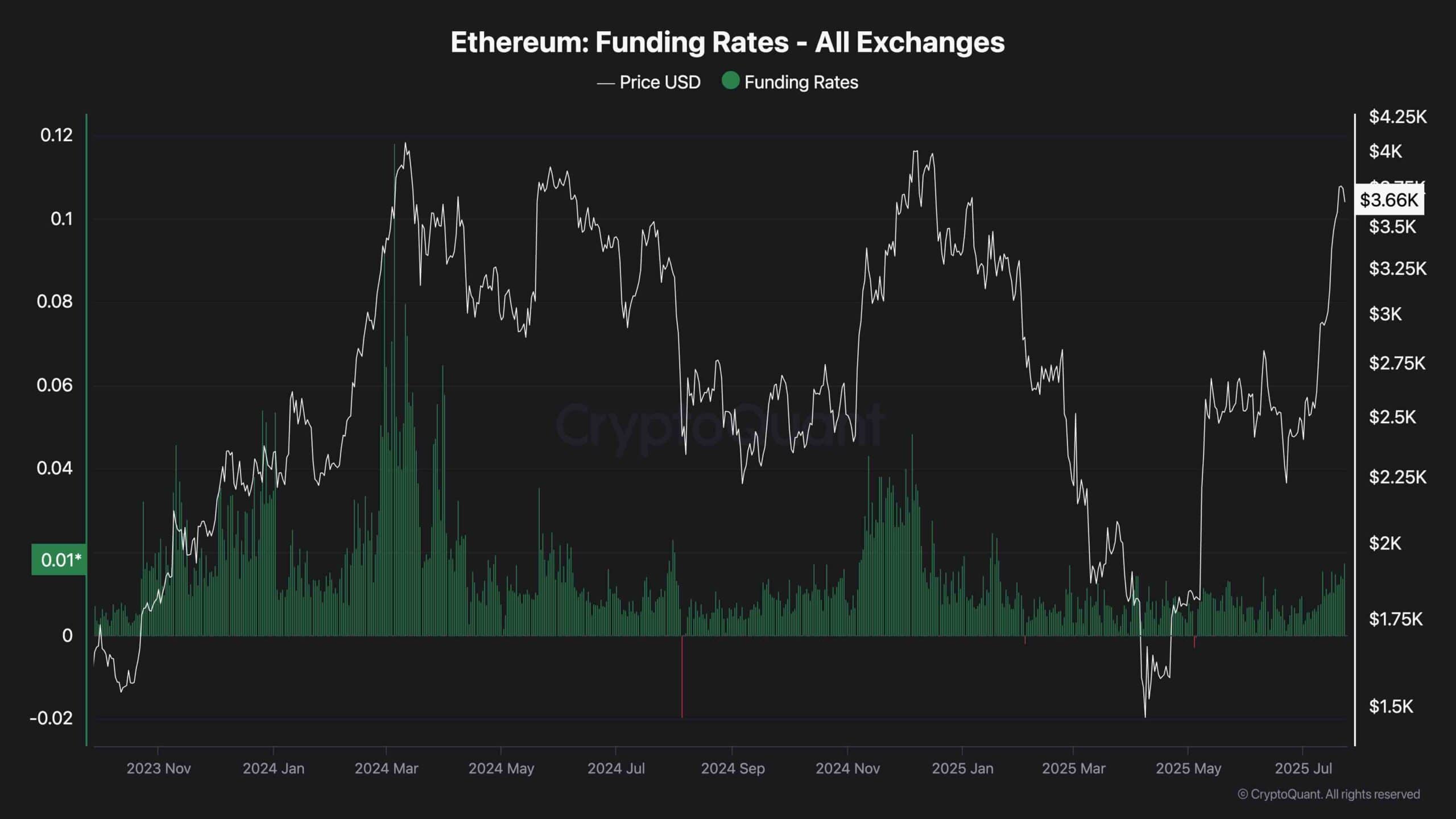 During previous cycle peaks, funding spiked aggressively, reaching levels that typically precede sharp corrections or long squeezes. Currently, funding remains relatively moderate, suggesting that although sentiment is turning more bullish, it’s not yet at a euphoric stage. This gives Ethereum some breathing room for further upside continuation as long as rates don’t escalate too quickly. Traders should still keep an eye on funding dynamics, as a sudden surge could be an early warning of overheating conditions.