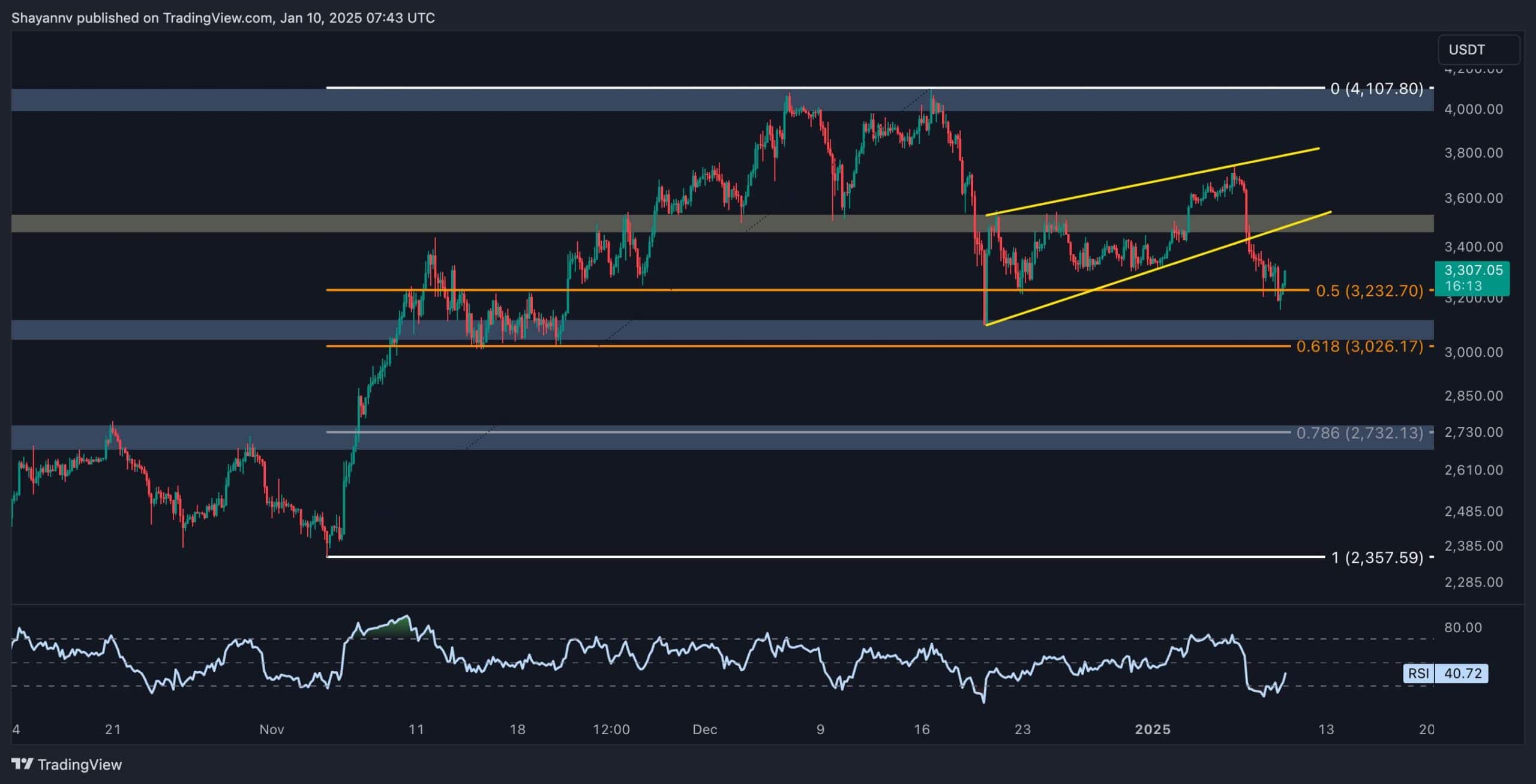 On the 4-hour timeframe, ETH’s price action reveals the consequences of breaking down from an ascending wedge pattern, a bearish technical structure that often precedes declines. This breakdown has led to a quick sell-off, with the asset now hovering near a support range defined by the 0.5-0.618 Fibonacci retracement levels.
