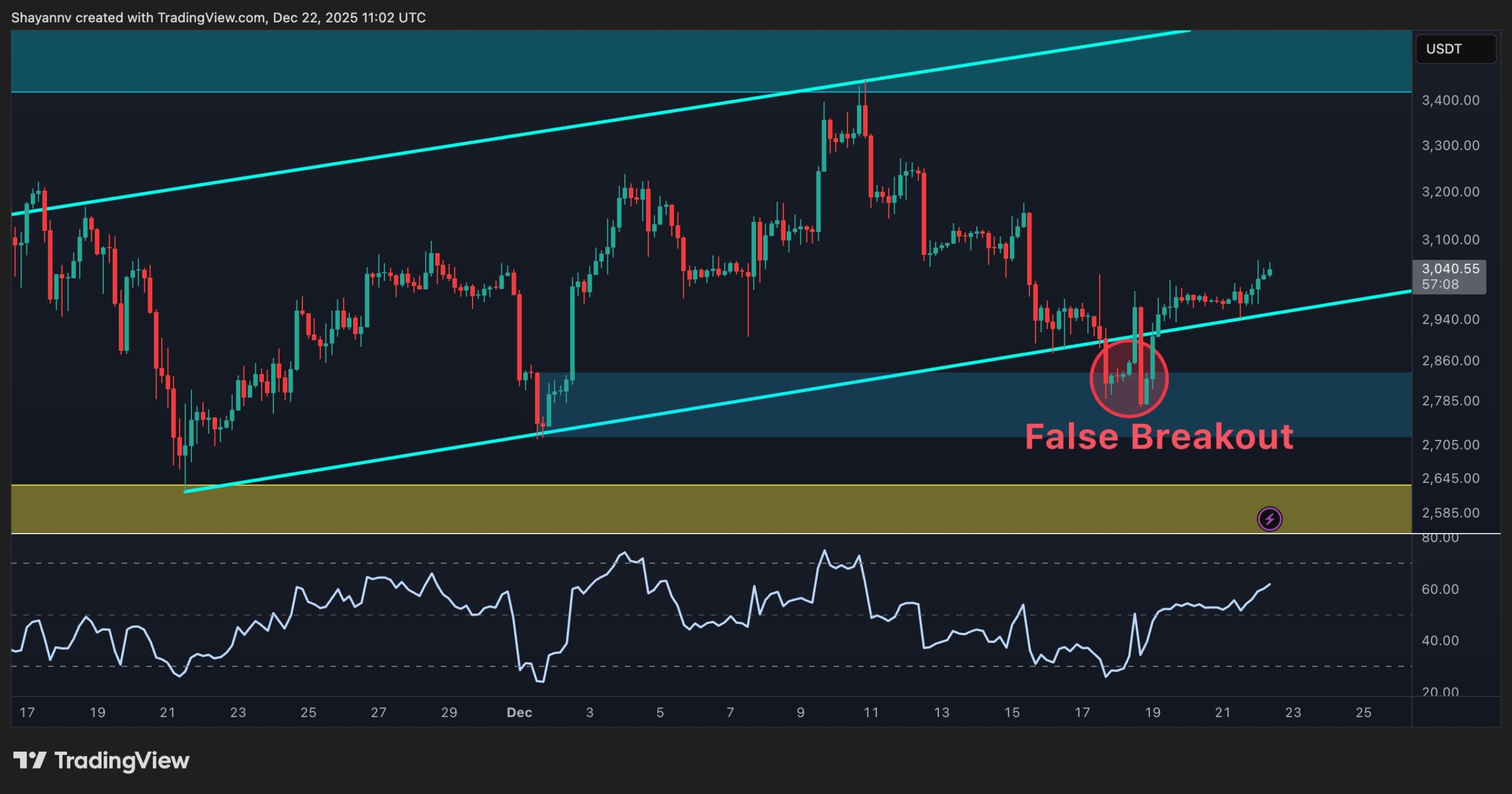 The price is now testing the same $3,000 level, which has previously triggered the last sell-off. If buyers can flip that zone into support, another bullish leg toward the $3,400–$3,500 zone could be expected. However, failure here would likely drag ETH back toward $2,900 and likely below the channel once more.