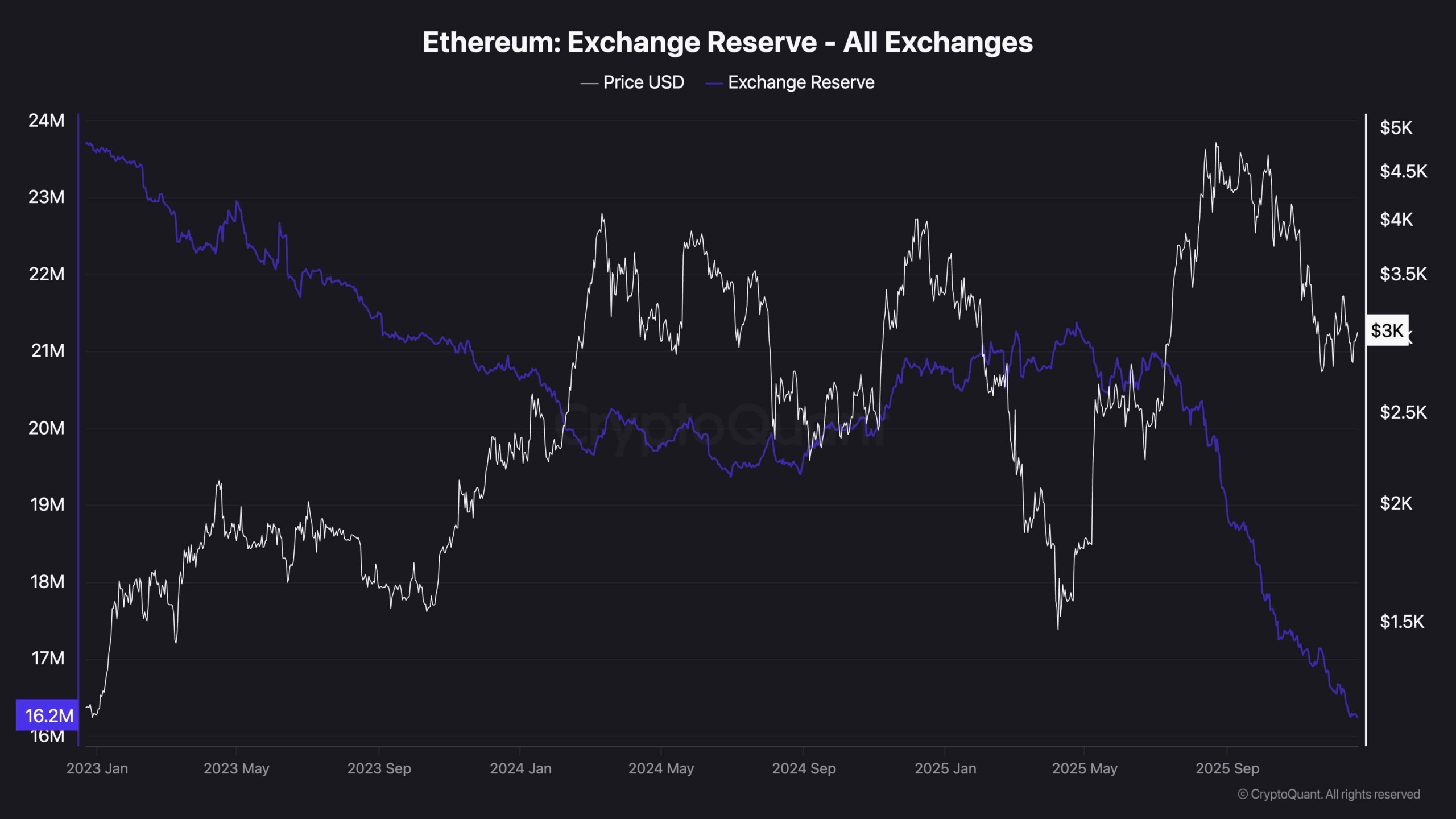 Ethereum’s exchange reserves continue to drop aggressively, now reaching the lowest levels in years (around 16.2 million ETH). This suggests long-term accumulation and reduced sell-side pressure from holders.