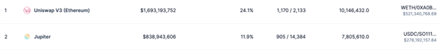 As such, Ethereum’s Uniswap has overtaken Solana’s leading DEX Jupiter in 24-hour trading volume after weeks of Jupiter’s dominance.