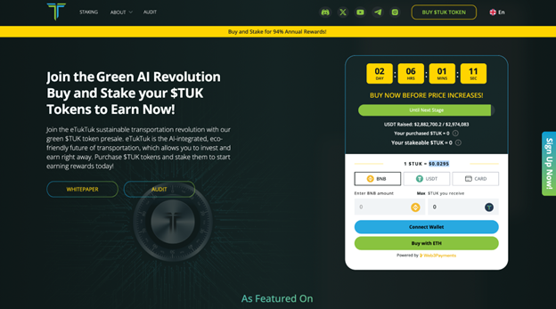 Green AI Presale eTukTuk Raises $2.8M and Offers 94% Staking APY