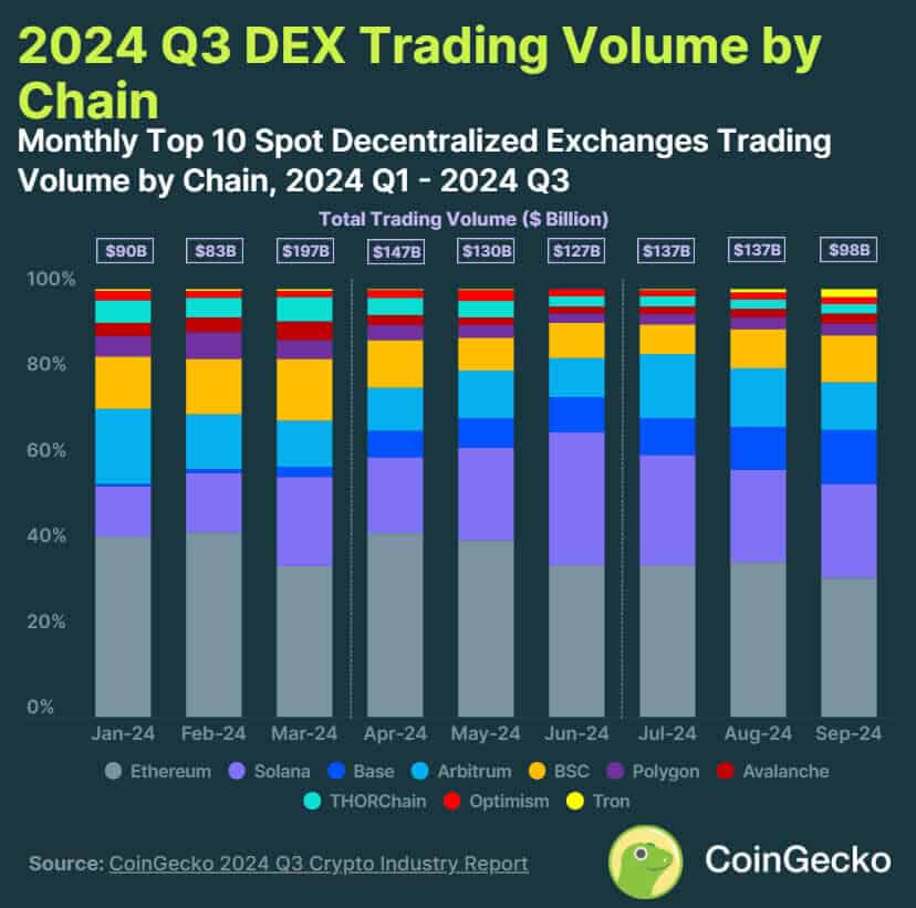 Ethereum’s position in DEX trading is changing, according to the CoinGecko Q3 crypto industry report released on Oct. 14.