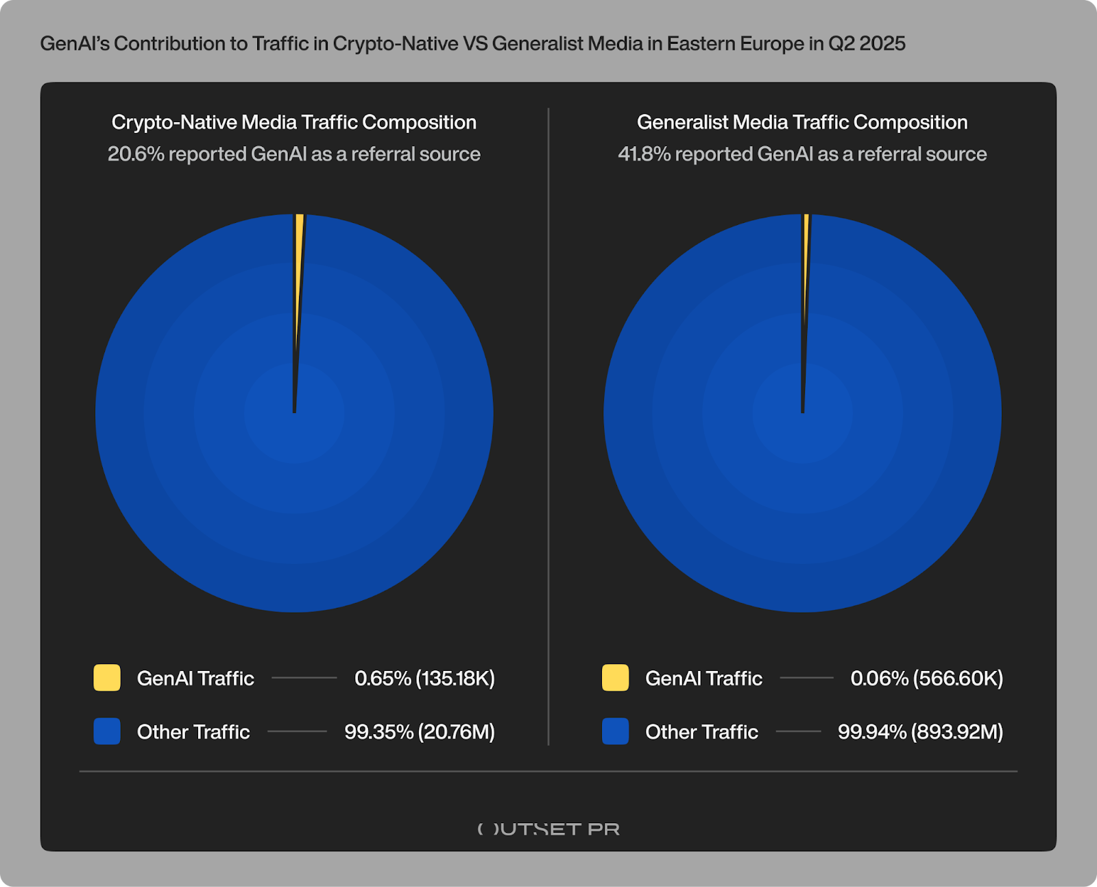 The broader trend is now visible even in specialized niches. Outset PR, a crypto-native PR data-driven PR has presented a Q2 2025 report on Eastern European crypto outlets performance. It revealed that more than 20% of 114 crypto-native media sites received measurable traffic from GenAI platforms.