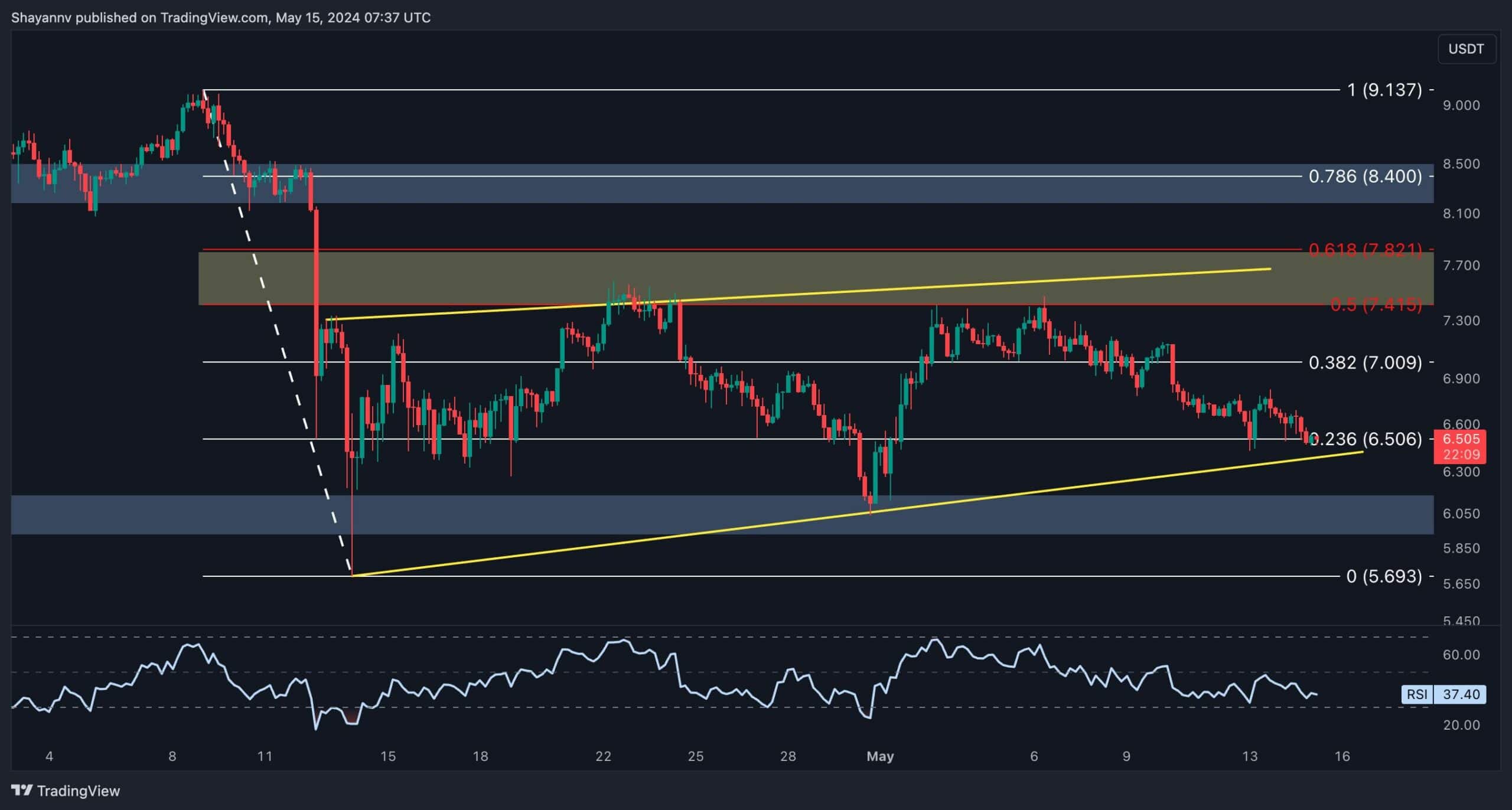 Despite this, considerable demand near this key level leaves room for a bullish rebound, potentially leading to a retracement towards the pattern’s upper trendline. Nonetheless, if the price ultimately breaches the lower boundary of the pattern, sellers will target the range’s lower threshold at $6.
