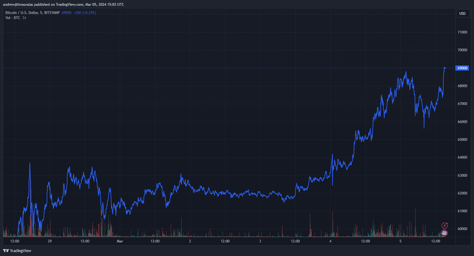 - The asset’s Tuesday rally began when the U.S. stock market opened at 9:30 am ET– a growing trend as ETFs take up a larger share of Bitcoin’s daily trading volume. The asset trades for $69,101 at writing time.
