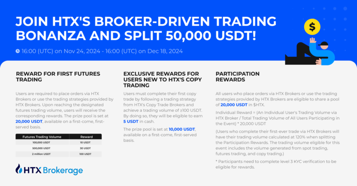 The celebration event, which runs from 16:00 (UTC) on Nov 24 to 16:00 (UTC) on Dec 18, is targeting users who trade through HTX Brokers. A total prize pool of 50,000 USDT is up for participants to share via three segments of the event.