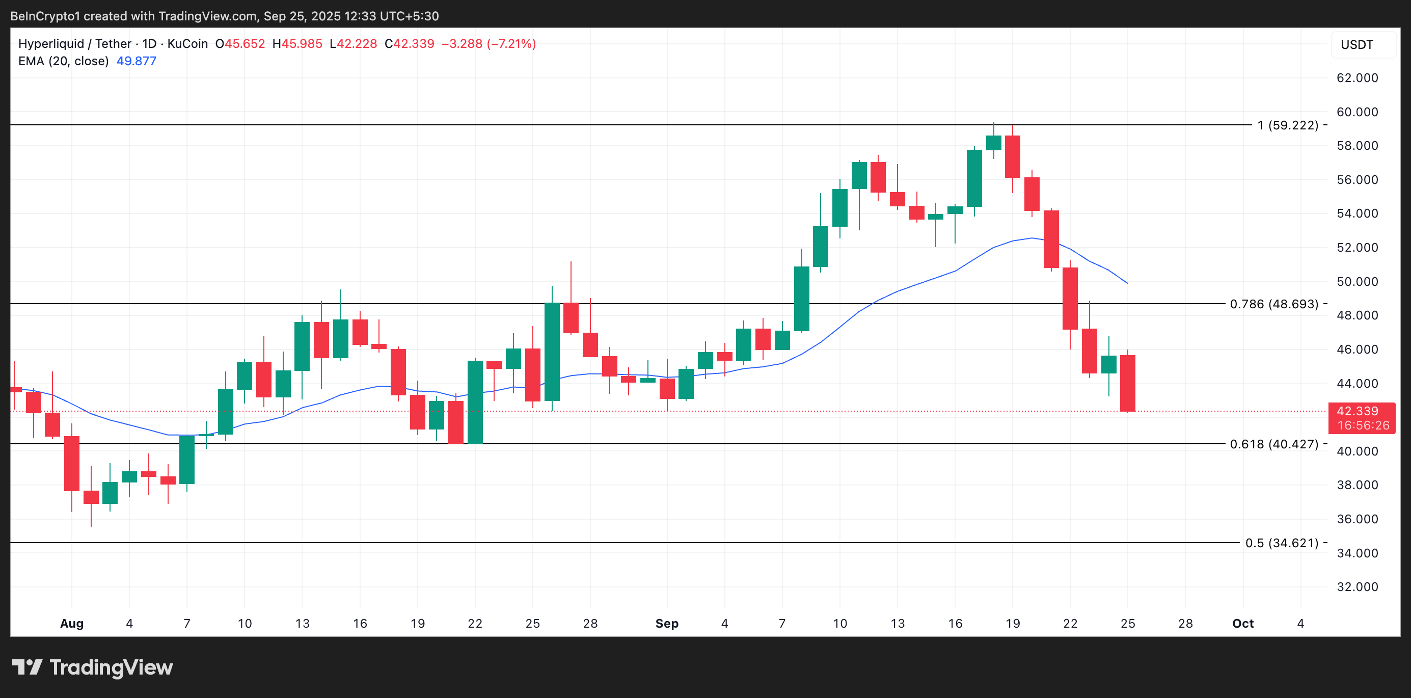 As user activity drops on Hyperliquid, demand for its HYPE token has also dwindled, putting pressure on its price. Exchanging hands at $42.39 as of this writing, the altcoin’s value has dropped by nearly 30% in the past seven days.