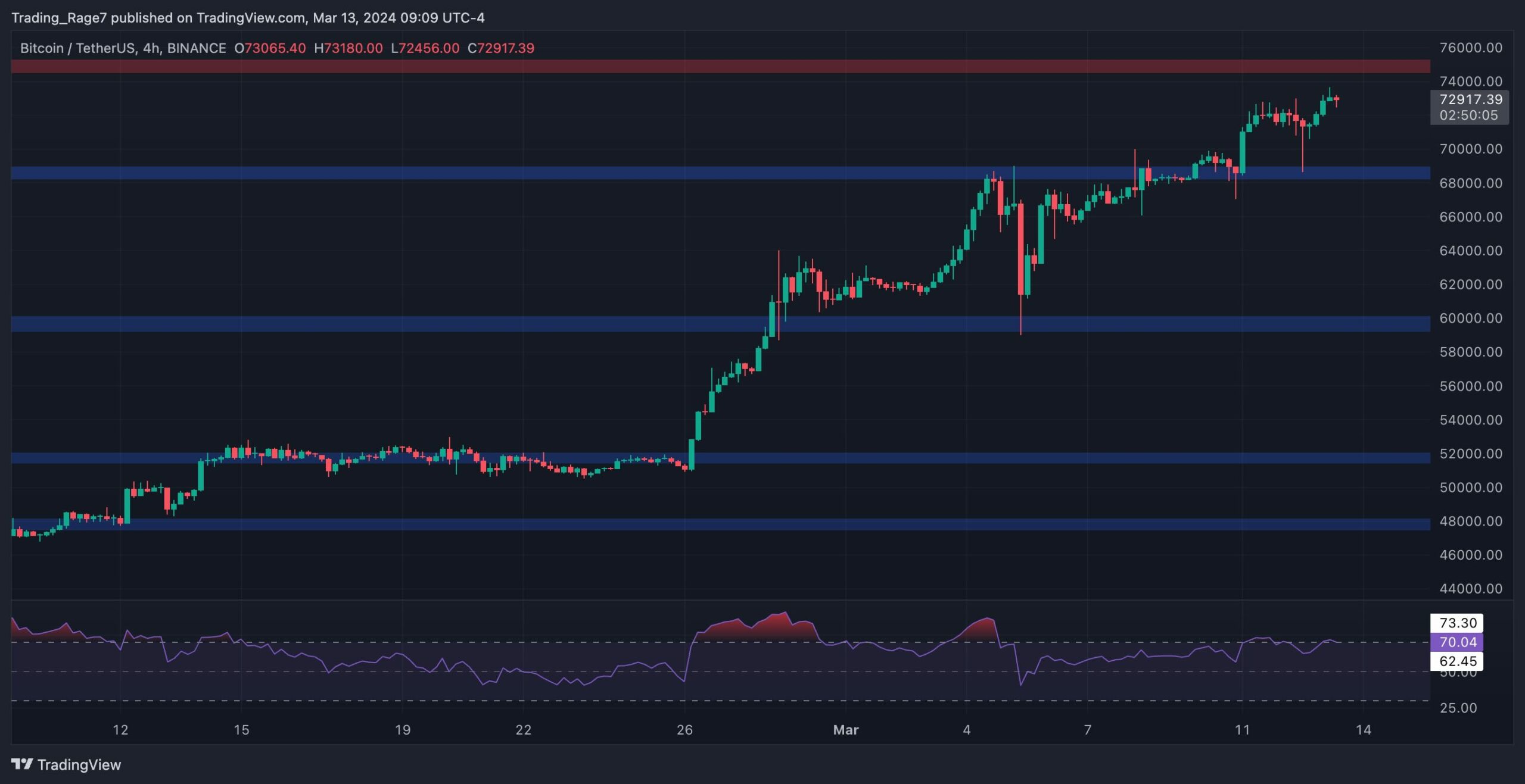 As the Relative Strength Index indicates, the momentum is still very bullish, and the market will likely reach the $75K level soon. Yet, if the oscillator shows an overbought signal or a bearish divergence, a short-term correction would be likely before a rally higher.