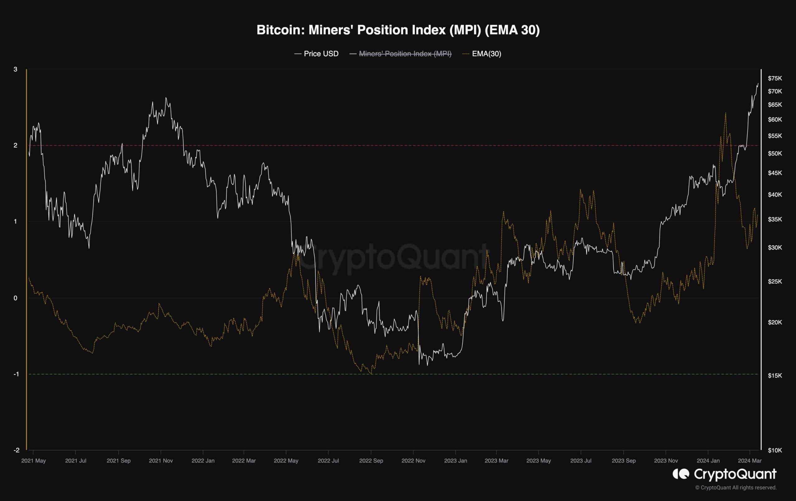 With Bitcoin’s price trading at all-time highs and approaching the $75K level, many market participants might be tempted to realize some profits. Miners are the most vital cohort in the Bitcoin network, so analyzing whether they are offloading their coins at a significant rate can offer valuable clues.