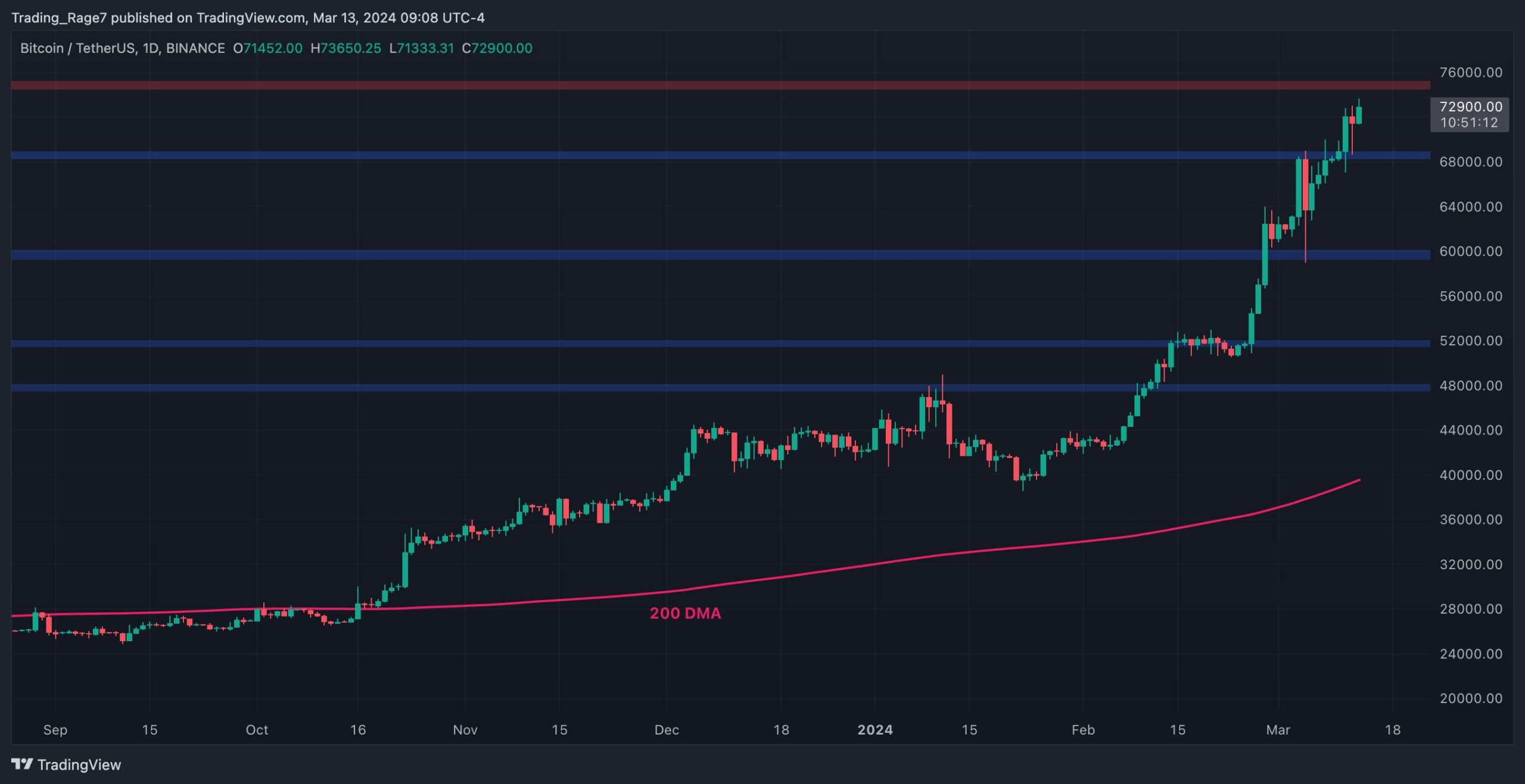 On the daily chart, the BTC price has recently broken past the previous all-time high of $69K. Bitcoin is currently being traded above $70K for the first time since its creation.