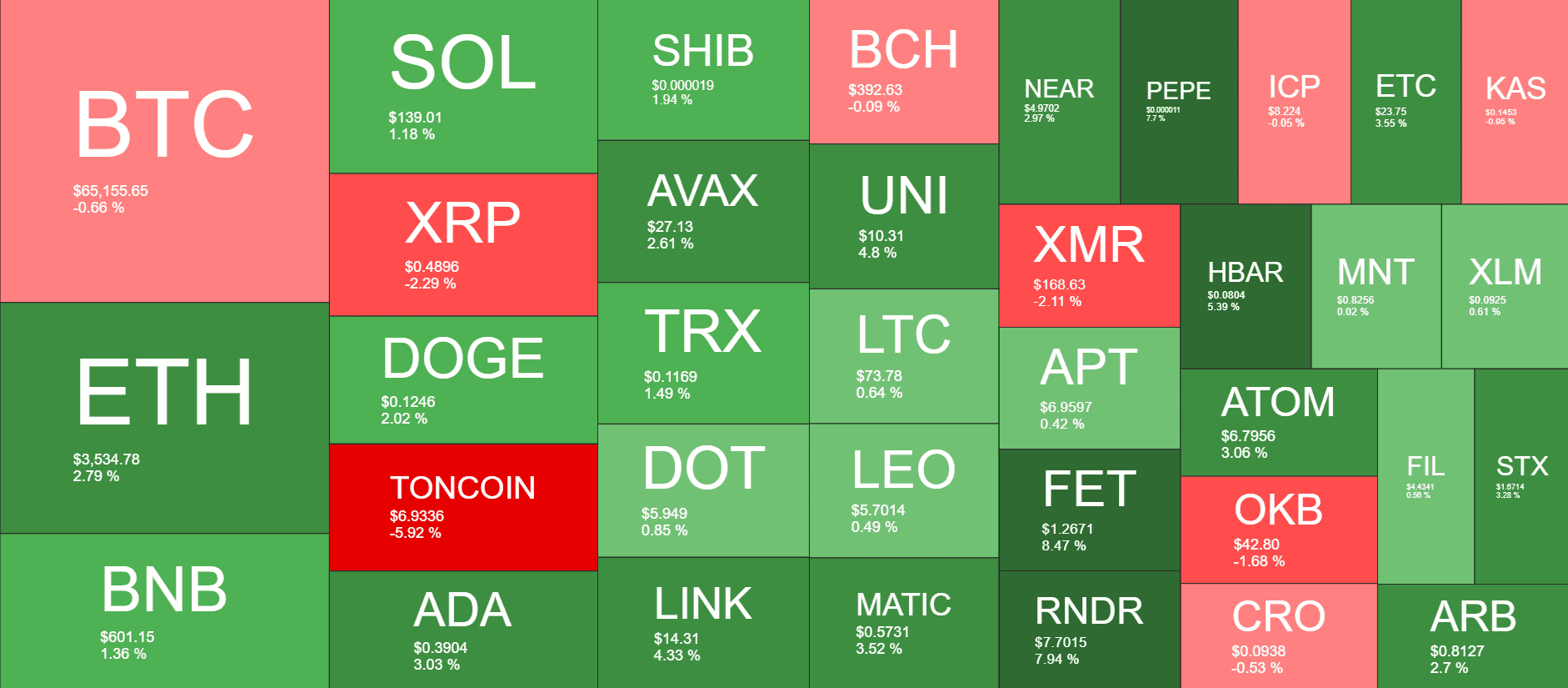 Other larger-cap alts with notable increases today include PEPE (8%), HBAR (5%), FET (8.5%), RNDR (8%), ADA (3%), LINK (4%), UNI (5%), and MATIC (3.5%).