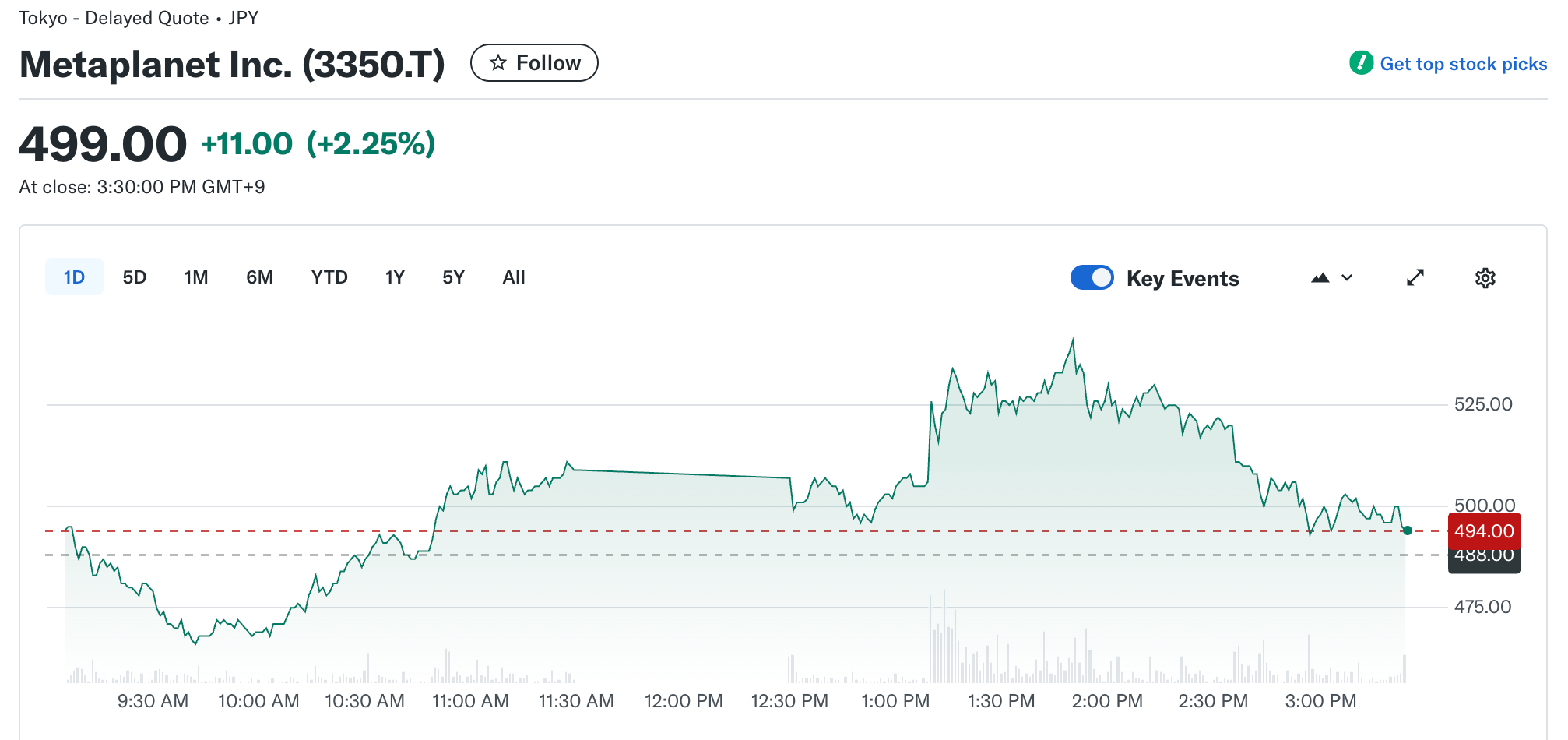 Following the announcement, Metaplanet shares closed at JPY 499 on October 28, up 2.25% from the previous session. The market response indicates investor interest in the company’s dual approach of BTC-backed financing and share buybacks.