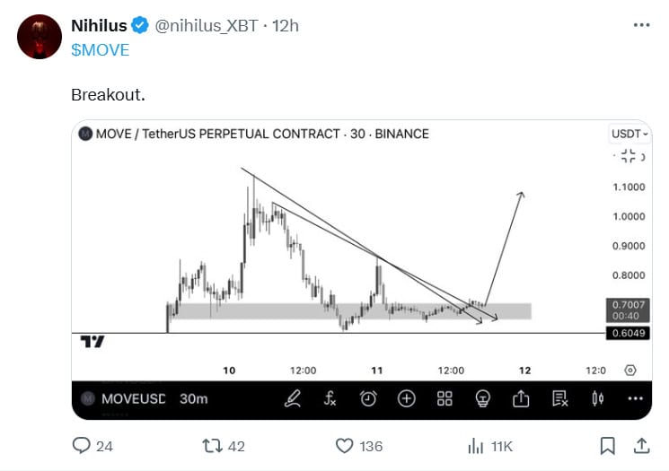 While high volatility has hit leading cryptocurrencies in the wider market, the $MOVE token has gained interest among crypto investors due to its outlook on its ecosystem. Influencers such as @nihilus_XBT and @CryptoProject6 have shown optimism in the future direction of $MOVE.