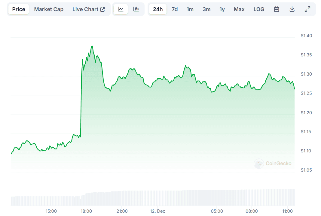 Peanut the Squirrel (PNUT) – a Solana-based meme coin which saw the light of day in November this year – took center stage today (December 12) thanks to its rapid price increase. Its valuation jumped by around 25% on a daily scale, reaching almost $1.40. In the past several hours, PNUT lost some steam, falling to its current $1.27 (per CoinGecko’s data).