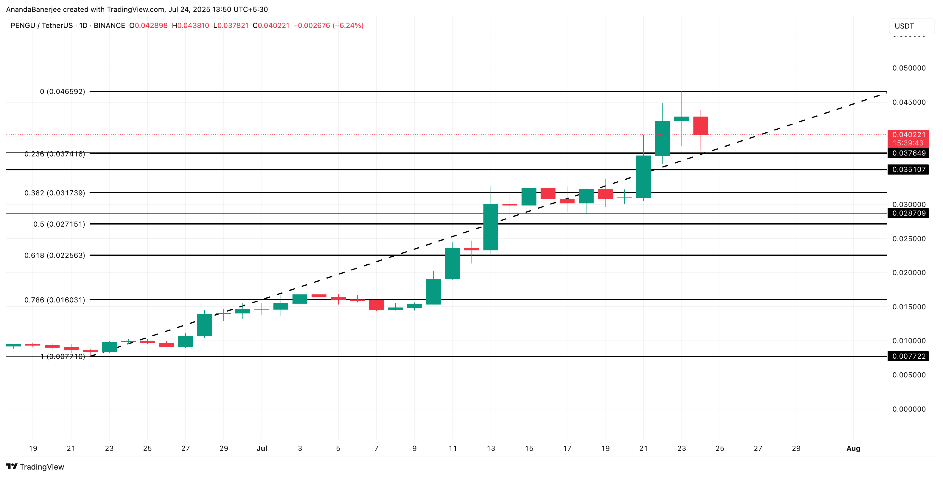 Technically, the PENGU price is holding right above a key support at $0.037, which aligns with the 0.0.236 level of the Fibonacci retracement indicator. It is drawn from the $0.0077 low to its all-time high of $0.46. The $0.037 level has seen bounces before, but if it fails, the next solid support lies near $0.031 — the 0.382 Fib level.