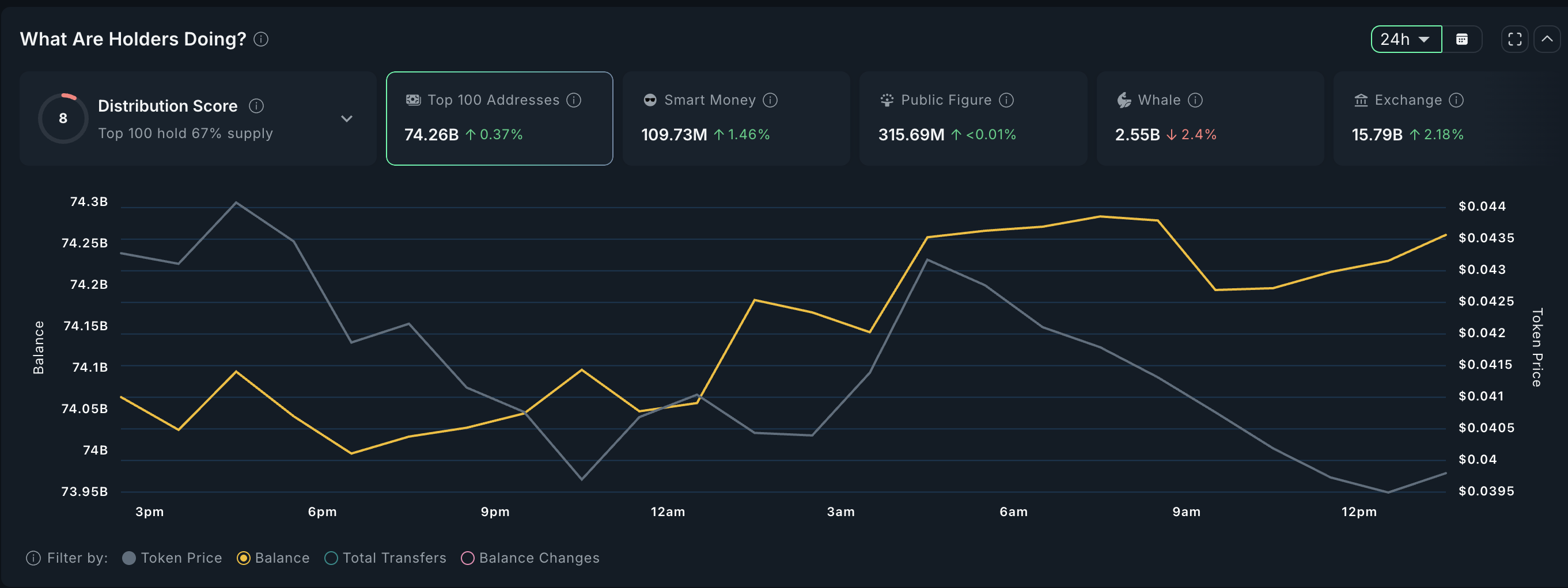 Whale activity continues to lean bearish. In the last 24 hours, whales trimmed another 2.4% of PENGU’s circulating supply. At the current price of $0.04, that’s around 152 million PENGU tokens worth over $6 million. While the pace of selling has slowed compared to the 30-day and 7-day trends, the overall direction remains downward.