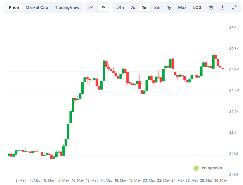 - Despite short-term volatility, ETH is up 45% monthly, with analysts forecasting a push beyond $3,000 in June.