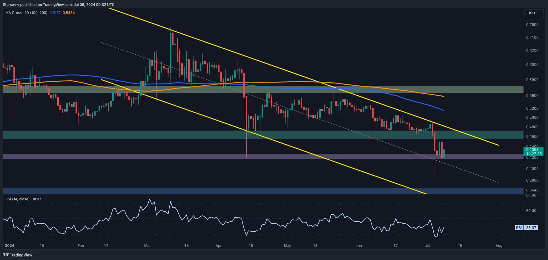 On the 4-hour chart, following an impulsive plunge, the price reached the crucial $0.42 support region and encountered increased buying activity.