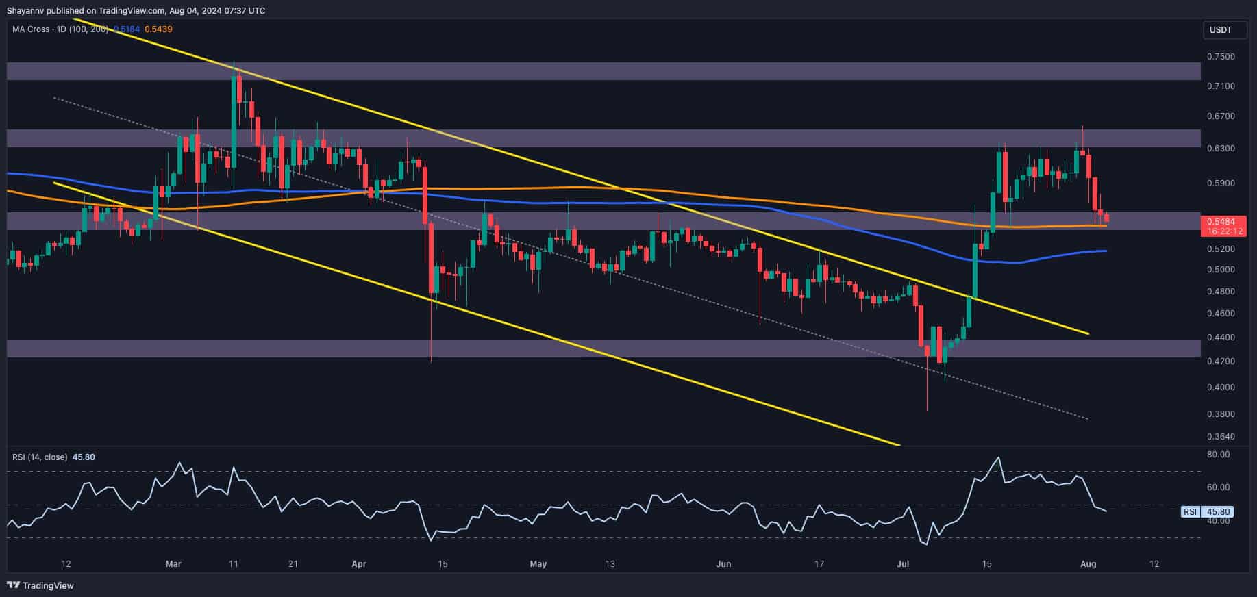 Currently, the price has reached a crucial support region around the $0.54 mark, where the buying pressure might emerge in the coming days.