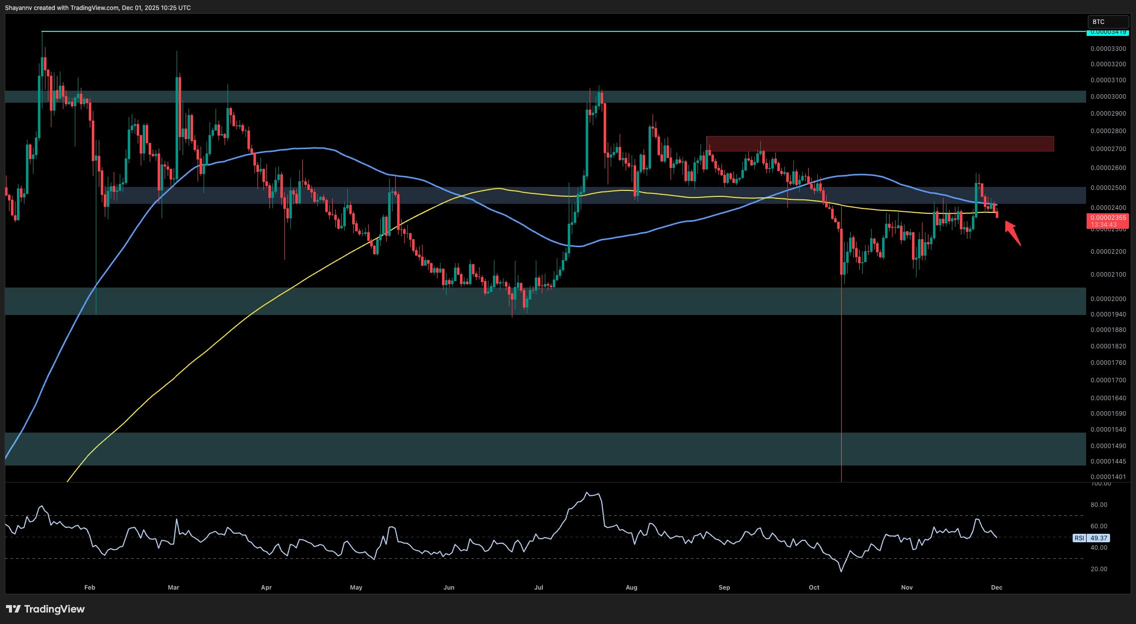 If the asset closes back below this key area, the entire move may be a deviation, with the downside target at 2,000 SAT looking more likely. On the other hand, XRP must reclaim and hold above the 2,500 SAT level to regain bullish momentum.