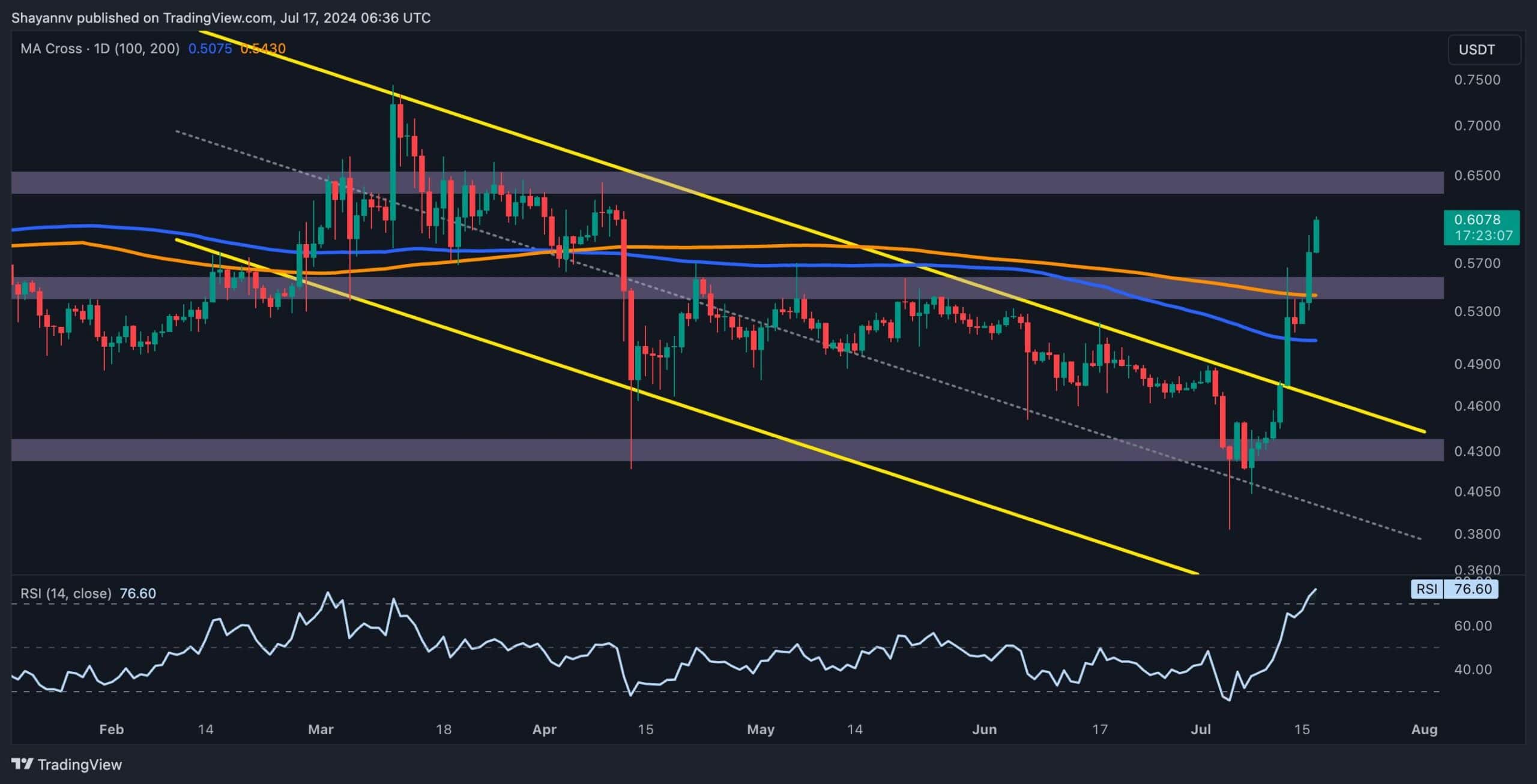 This surge allowed XRP to break out of a multi-month descending channel, surpassing several resistance zones, including the 100-day ($0.50) and 200-day ($0.54) moving averages and the crucial $0.55 static resistance level.