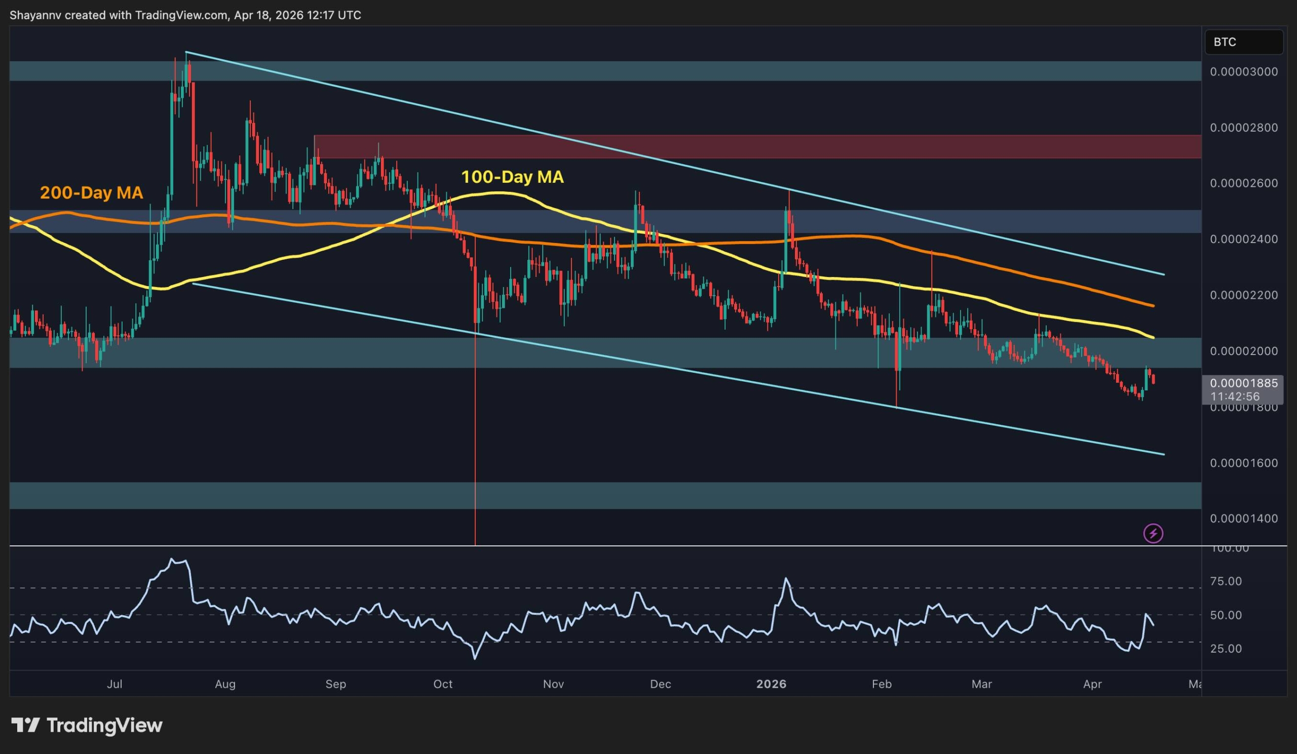 Both the 100-day MA (~2,000 sats) and 200-day MA (~2,100 sats) remain well above and declining, with the descending channel structure firmly intact. The RSI has bounced from deeply oversold territory in the low-20s back toward the mid-40s, which could support a short-term relief bounce on this pair, but a bounce is very different from a reversal.