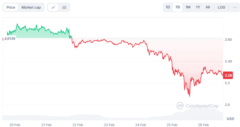 Ripple’s native token was among the worst-affected digital assets during the crypto market crash witnessed on February 25. Its price tumbled to $2.07 (per CoinMarketCap’s data) before rising to the current $2.26. Still, the ongoing level represents a 13% decline on a weekly scale.