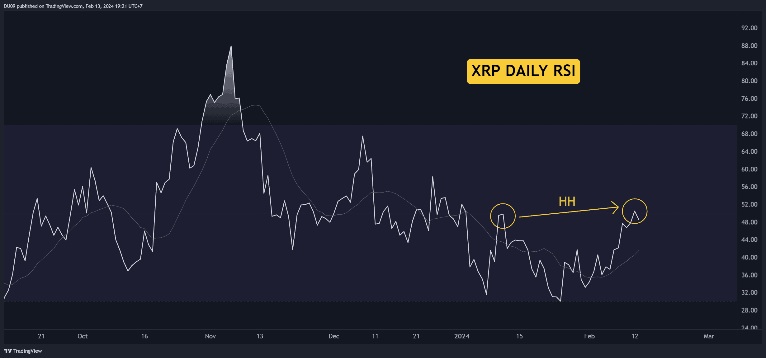 The daily RSI has made a higher high. This is an early signal that this cryptocurrency wants to move higher. The key resistance at 54 cents is the only thing stopping buyers from pushing XRP into a rally.