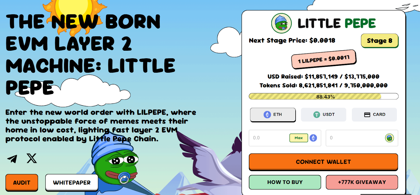 Little Pepe ($LILPEPE), a new Ethereum-based meme coin, is attracting serious attention as it nears the end of Stage 8 in its presale. With a current price of $0.0017, the token is set to rise to $0.0018 in the next stage. Investors have already contributed approximately $11.85 million out of a $13.775 million target. So far, 8.62 billion tokens have been sold, filling over 88% of the stage’s allocation.