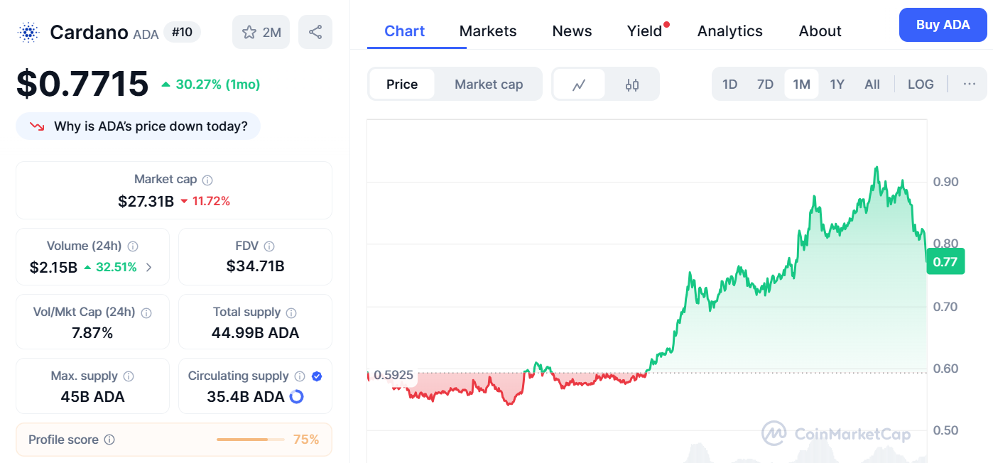 Cardano (ADA), another under-$1 token, is also generating attention. ADA is currently priced at $0.77, marking an 11.7% decline over the last day due to the overall market volatility. Its market cap stands at around $28.2 billion, and daily trading volume hovers near $2 billion. Like Little Pepe, Cardano is known for its advanced blockchain features and strong developer support.