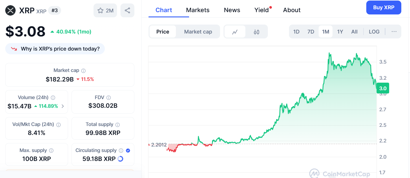 Ripple (XRP), a major player in the crypto market, is currently trading at $3.09. XRP has dropped 11.05% over the past 24 hours. Despite this dip, analysts believe the coin could still grow fivefold in the near future, as it’s still up more than 40% over a month. XRP’s market cap sits around $184.3 billion, with a daily trading volume of approximately $14.5 billion.