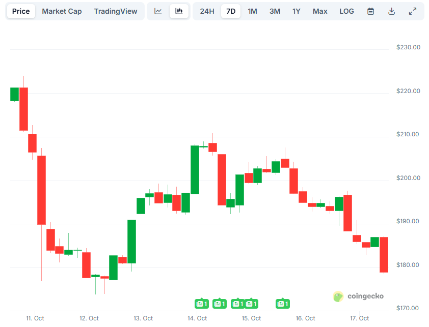 The native token of Solana is also deep in red territory, crashing by 18% on a weekly scale and currently trading under $180.