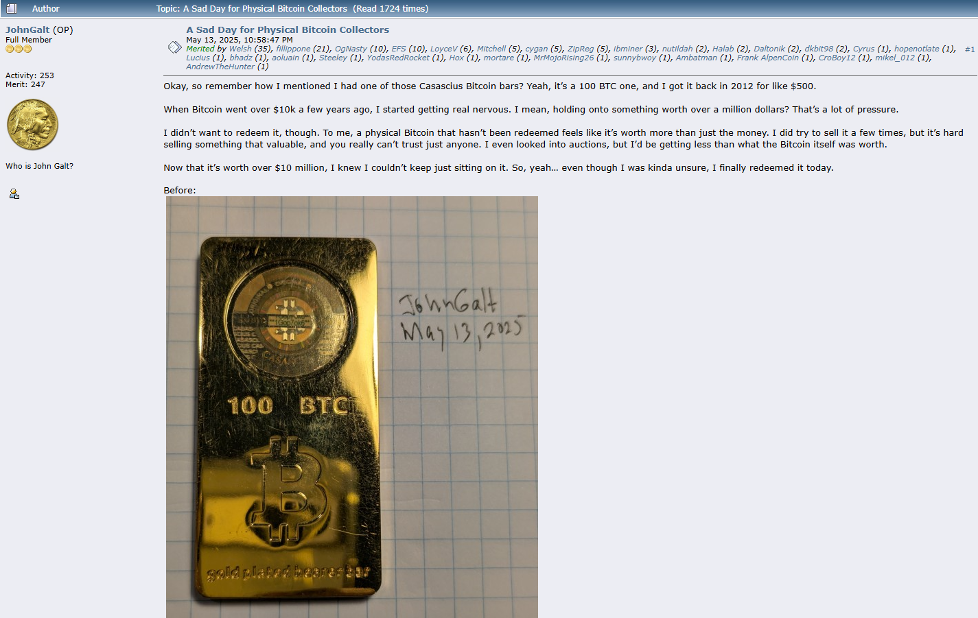 On May 13, 2025, an early investor known as ‘JohnGalt’ decided to cash in on his decade-old physical BTC collection.