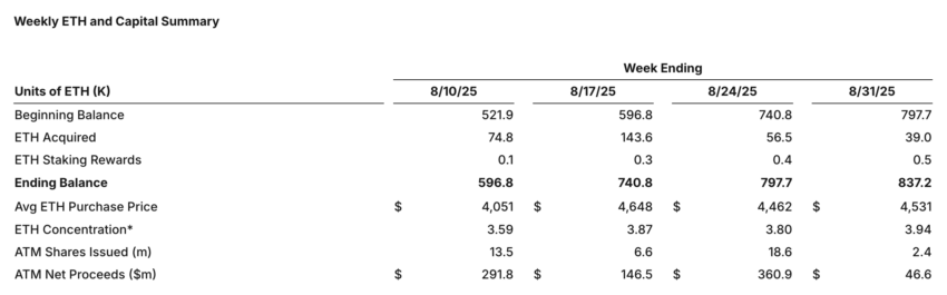 SharpLink Gaming (SBET) disclosed that it purchased more than $176 million in ETH during the final week of August. The acquisition raised its total stash to 837,230 ETH, valued at nearly $3.6 billion as of August 31.