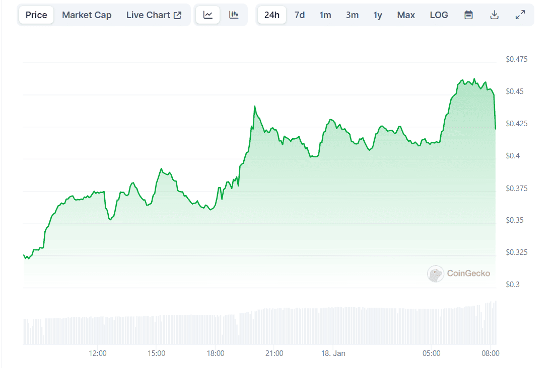 The recently-emerged Solana-based meme coin – dogwifhat (WIF) – experienced another impressive rally today (January 18), surging to an all-time high price of over $0.45 (per CoinGecko’s data). It has been among the market’s top performers lately, skyrocketing by 120% on a weekly scale and 250% in the past 30 days.